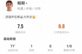 体育资讯2月19日讯 科莫在本轮意甲1-1暂时战平米兰,帕斯本场数据如下: 首发出战71分钟 1球 1射1正 3过人、1成功 17丢失球权 预期进球0.36 47触球 27传球,成功率70.4% 1传中 2拦截 2抢断 10对抗、5成功 2犯规 1…
