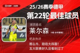 直播吧X小红书|德甲第22轮最佳:莱尔森当选!助攻大四喜满分表现 足球比分直播 2026年2月17日 2025-2026赛季德甲火热进行中,体育资讯和小红书联合发起每轮德甲最佳球员评选活动! 第22轮评选结果出炉,多特蒙德球员莱尔森单场助攻大四喜,赛后获评10分,助多特4-0大胜美因茨,当选【体育资讯X小红书德甲第2… 阅读全文