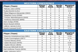 NBA直播全明星首发投票详情:西SGA媒体第1&约基奇球员第1东CC球员第1 篮球比分直播 2026年1月19日 NBA直播纪录终结!詹姆斯连续21年入选全明星首发纪录就此终结!免费NBA在线直播_篮球NBA比分网 体育播报01月20日宣 2026年NBA全明星首发出炉,随之的全明星首发投票详情也出炉。 投票由球迷(fan)、球员(player… 阅读全文